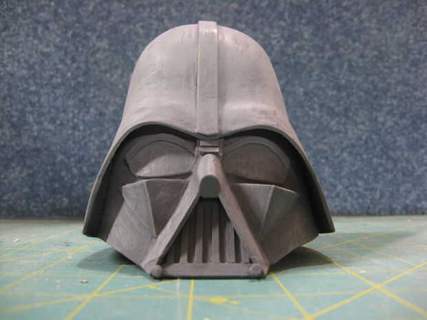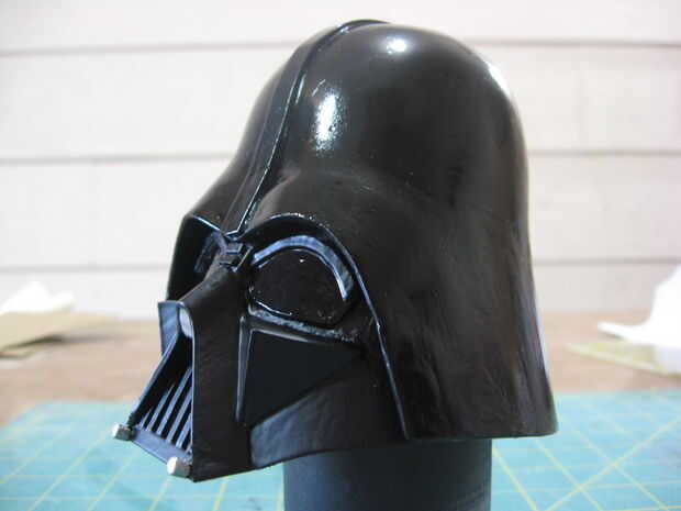 Le di el casco unas capas de imprimación, lijar suavemente entre capa y capa. La cara tiene un recubrimiento de pintura negro mate, y el casco tiene una capa de lustre negro. Se retocado los ojos con negro brillante, y se añadieron detalles plata.