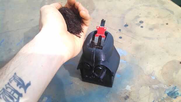 ahora añadir algunas semillas y agua, no demasiado. puede cubrir la parte roja del sensor de suelo en el pegamento caliente para hacerla impermeable, o tenga cuidado al regar si tienes manos constantes :)