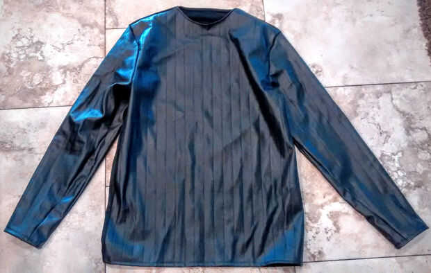 También puede hacerlo usted mismo utilizando un patrón básico de camisa de manga larga y pantalones. Pueden ser muy básicas sin bolsillos, cremalleras, etc.. Puede utilizar un cuero negro buscando material y cortar las piezas. Entonces sugiero hacer las líneas de acolchado antes de coser las piezas juntos. También, una buena sugerencia que vi era con un tejido ligero y transpirable para la espalda de la camisa en lugar de la piel. Esto ayudará a mantenerlo fresco, y nadie verá bajo la capa (también menos acolchar líneas para coser).