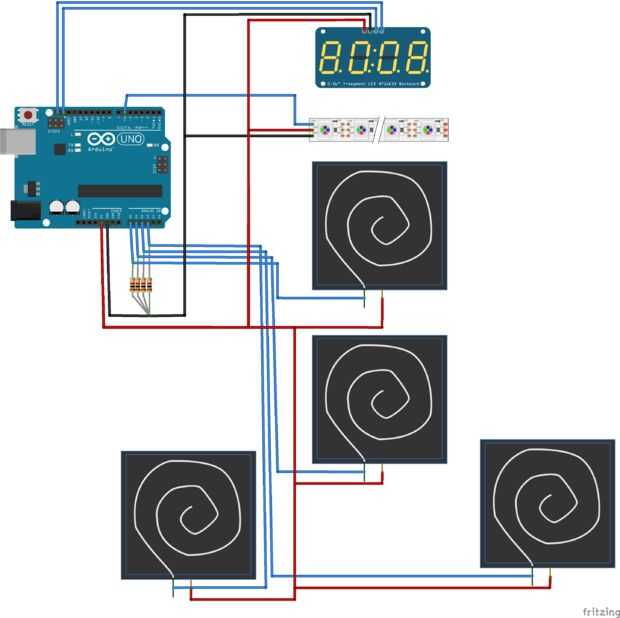 Conectarlos todos juntos según el diagrama de cableado. Cuenta que una cosa incorrecta en el diagrama de la energía (5v) para la tira de LED, que tiene que ir a una fuente de alimentación separada, no el pin de 5v de arduino.