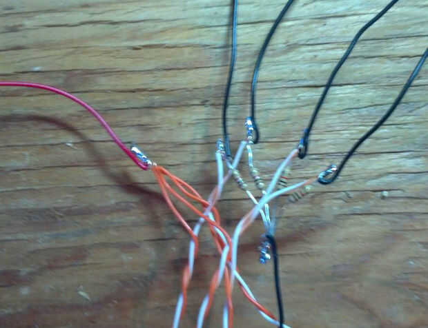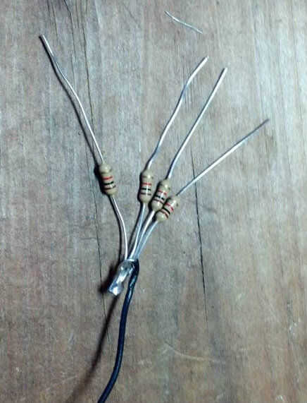- La soldadura a uno de los extremos de los cuatro de las resistencias a un cable que irá a tierra.