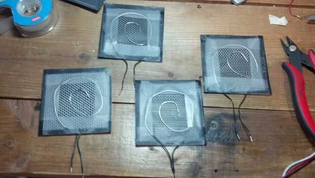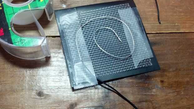 4. ahora hacer un sándwich que va: rizado de malla, alambre rizado, velostat, alambre, malla. Es más fácil hacer este uno lado a la vez colocando el hilo rizado en la parte superior la velostat, y al colocar la malla sobre eso, fijándolas en lugar con cinta adhesiva, luego los bancos lo haciendo lo mismo.