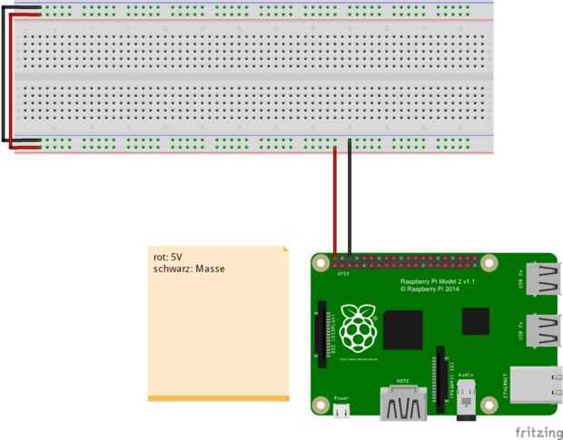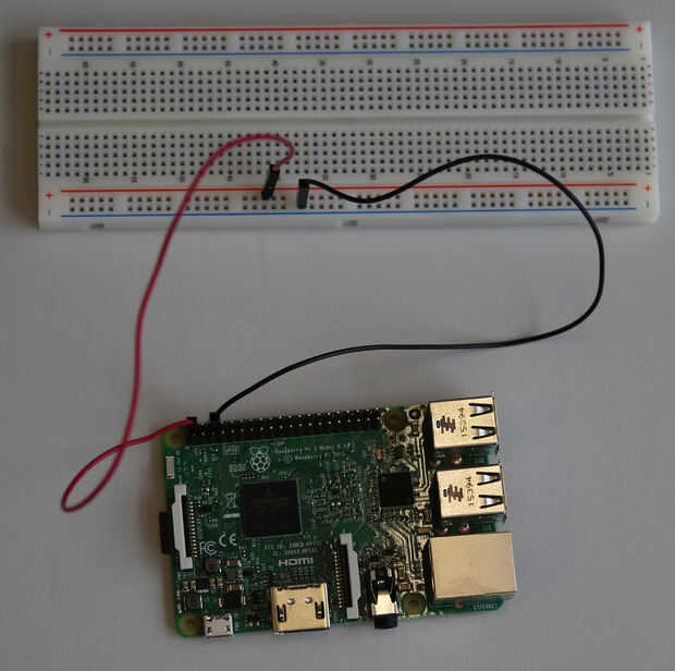 Für diesen Schritt brauchst du: 1 x frambuesa Pi 2, 1 x Breadboard, Kabel en putrefacción und schwarz, Steckbrücken für protoboard