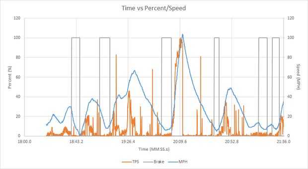 Esta es la realmente la parte más difícil, qué hacemos con los datos. Más fácil es trazar gráficas con algo como Excel y comprobar sus tendencias, ver cómo grandes son los huecos de tiempo de transición del freno del acelerador, ver cómo de consistente es con el acelerador, etc.. No dejes que te engañe pero los datos. Si usted toma una mirada en la muestra de datos que postee te pueden ver un montón de picos, ¿crees que ha de ruido, pero ¿es? no, bueno depende de lo que está tratando de buscar, pero que en realidad me blipping el el acelerador mientras que yo soy baja. :) Si agrega una entrada de sensor para el embrague e interruptor de punto muerto que puede eliminar ese ruido hacia fuera, pero otro entonces que tendrás que aprender a analizar los datos.