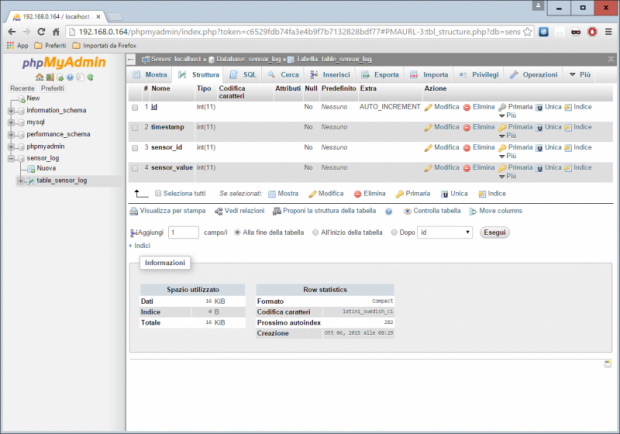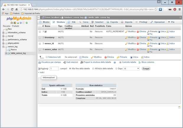 Crear una nueva base de datos con nombre sensor_log y un nuevo table_sensor_log de la tabla con 4 campos como se muestra a continuación