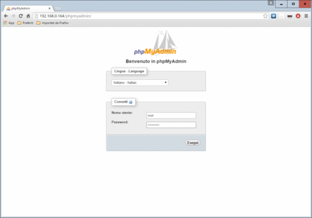 Abrir phpMyAdmin desde su navegador http://raspberry-ip/phpmyadmin/index.php y conéctese como "root" con la contraseña administrativa que ha configurado anteriormente.