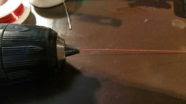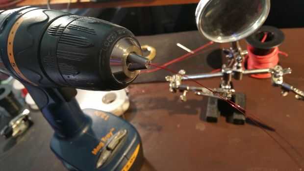 Para cada interruptor necesitamos dos filamentos de 6 pulgadas de largo. Para mantenerlo aseado me di cuenta de este truco. Corte primero sobre un pie o tan del alambre de la bobina, luego doblarlo sobre en él uno mismo por lo que tiene dos cables que se unen en un extremo. A continuación, la tirada el extremo doblado en el taladro, conseguir como cerca del centro de la tirada como sea posible. Entonces sostenga un extremo del par de filamento, mientras tuerce el otro extremo con el taladro. Esto retorcer los dos juntos lo que más limpio y fácil de manejar. ADVERTENCIA pequeño uno, no girar demasiado apretadas o que llegan a ser frágiles y es más probable que rompa con el uso. Hice este error la primera vez y tuvo que rehacer dos de mis cables.