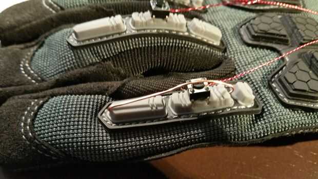 Lo siento por la falta de medidas, libre entregué esta parte y tomó una pequeña experimentación. El resultado debe ser un poco de alambre resistente que se ajusta perfectamente sobre la parte superior del botón y se ha quedado atascado en los protectores de goma en ambos extremos. Todo esto tiene un poco de flex en él por lo que no debería desencadenar el botón a menos que usted realmente la flexión del dedo.