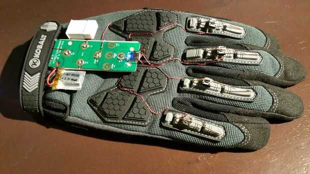 La placa de circuito para el ratón de aire debe montarse en la parte posterior del guante. La orientación es importante, que el puerto USB debe ser hacia delante, con la tecla de contactos visible. Montara primero con cinta de la espuma, pero decidí que eso él se movió alrededor de demasiado y no era lo suficientemente seguro. Al final, me decidí a coser en el guante, bucle algunos monofilamento (sedal o hilo fuerte debería funcionar) a través de los cuatro agujeros alrededor del borde del tablero.