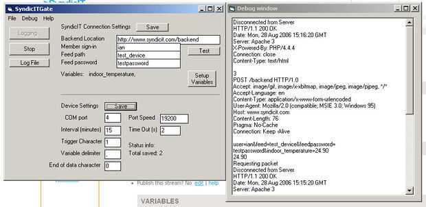 Haga clic en 'Start' para iniciar registro de datos. Si la ventana de depuración está abierta se mostrará el cuadro de diálogo de comunicación entre syndicitGATE, syndicit.com y el dispositivo.