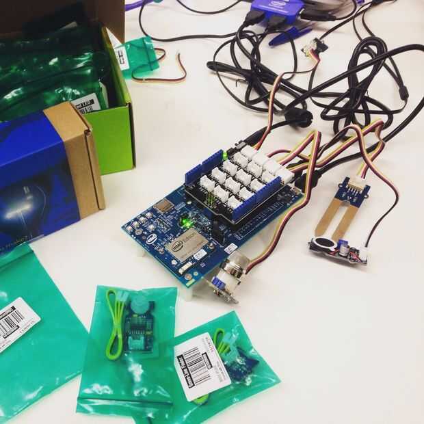 Enchufe por primera vez el escudo base de grove en el tablero de Edison de Intel. Entonces puede empezar tapando los sensores en el protector de base. Buscar la base pantalla de identificadores como A0 y D4.