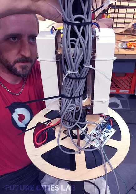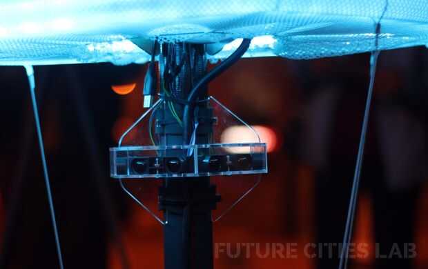 La electrónica ejecuta datos linterna es un teensy, dos fuentes de alimentación de 5V y seis sensores infrarrojos. La mayoría de la electrónica está escondida detrás de la falda interior mientras que los sensores están alojados en una caja de acrílico sentado debajo de la linterna.