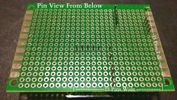 Volcar el perfboard, puedes ver que mi configuración toma 15 x 15 pines.