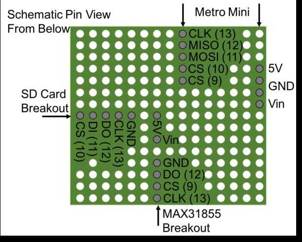 En la vista esquema que se muestra de la misma orientación, yo he marcado los pernos y las placas pertenecen a. 2 etiquetas que no verás escritas en la placa son MISO y MOSI. Estos soporte Master n Slave Out y ut de O Master Slave n, respectivamente. Estas son cada comunicación bidireccional 1 líneas usadas para SPI, o Serial Peripheral nterface, protocolo de comunicación. Utilizaremos este protocolo para hablar hacia adelante y hacia atrás desde el Metro Mini (el maestro) con el termopar y la tarjeta SD (los esclavos). MISO y MOSI pernos mini Metro son hardware configurado como pines 12 y 11, respectivamente. El pin de reloj, CLK, es también hardware configurado como pines 13 y todas estas configuraciones coinciden con el Arduino Uno, una tabla de prototipos de micro controlador más común puede ser más familiar con.