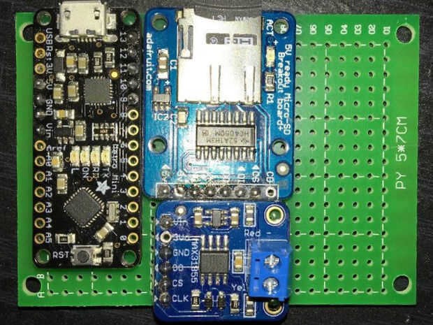 Con el SPI, muchos dispositivos pueden compartir una sola línea MISO (comúnmente marcado como a los esclavos), línea MOSI (comúnmente marcado como DI en los esclavos) y CLK. La conexión única que necesita un esclavo es la línea CS o chip select. En este caso tengo la SD tarjeta CS va al pin 10 y el CS de termopar va al pin 9 mini Metro. Vamos a hablar en un dispositivo a la vez usando el código para establecer su estado de pin CS en baja (el estado activo en este caso), con CS otros dispositivos alta (estado inactivo). Todos estos números de conexión pin que he mostrado en () en el esquema.