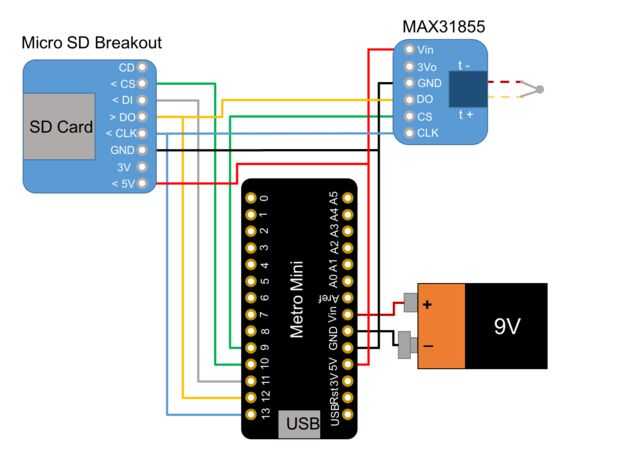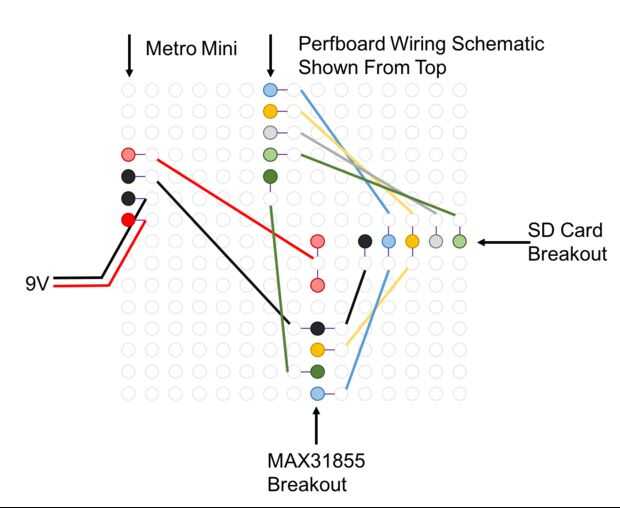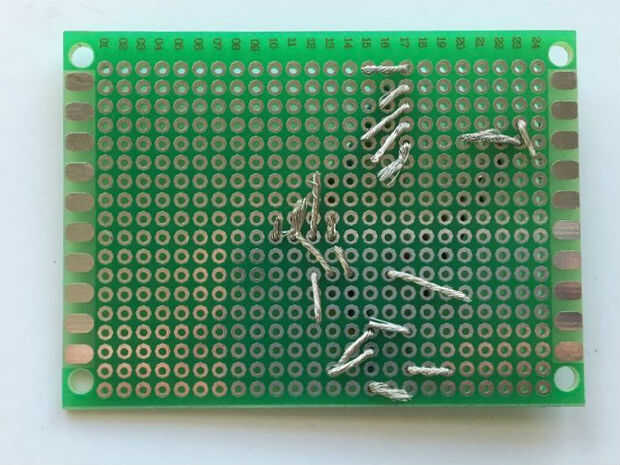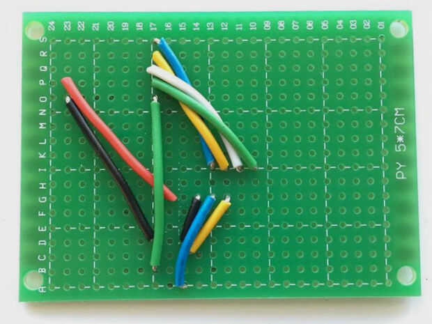 Se muestra un diagrama esquemático de cableado del dispositivo. En la siguiente imagen, he tomado el perfboard esquemático, esta vez vista desde arriba (el lado sin cojines de la soldadura) y dibuja lo que será las conexiones físicas como gruesas líneas de color. Las líneas delgadas cortas será soldadura conexiones de puente para un paso posterior.
