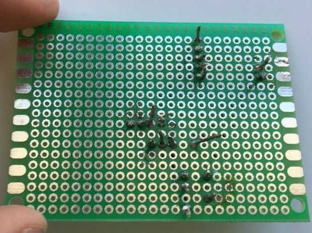 Tomar su perfboard y cables y replicar el esquema. Corte cada cable a ligeramente oversize, luego tira de los extremos para que llegue a la parte aislada del alambre de agujero a agujero según sea necesario. Alimentar los extremos pelados del cable a través el perfboard y luego doblar sobre los extremos en la parte trasera para los cables en su lugar, como se muestra. Las puntas del clip de batería no se muestran en estas imágenes, sin embargo lo mismo puede hacerse con los cables en este tiempo también.