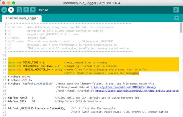 Estos son lo que usted va a cambiar para adaptarse a las condiciones de medición deseado. Para comprobar que todo está funcionando, presione el botón 'Subir'. Una vez finalizado, abrir el Serial Monitor para supervisar el estado del sistema. Si toca el extremo del termopar debe ver las lecturas de temperatura subir. Una vez completado, introduzca la tarjeta SD en el ordenador y compruebe que el archivo csv está presente y pobladas con los datos.