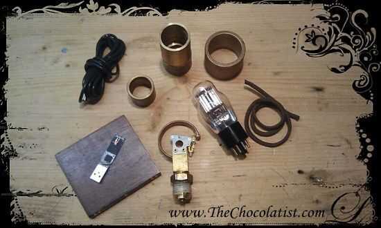 Para este pequeño proyecto utilicé algunas partes de mi "almacenamiento" de piezas metálicas de latón, un viejo tubo de vacío rotas, un memoria USB de regalo promocional, un cable con conector USB, una goteo-estera de madera, la parte mecánica de un calibrador de presión roto y algunas otras piezas para la decoración.