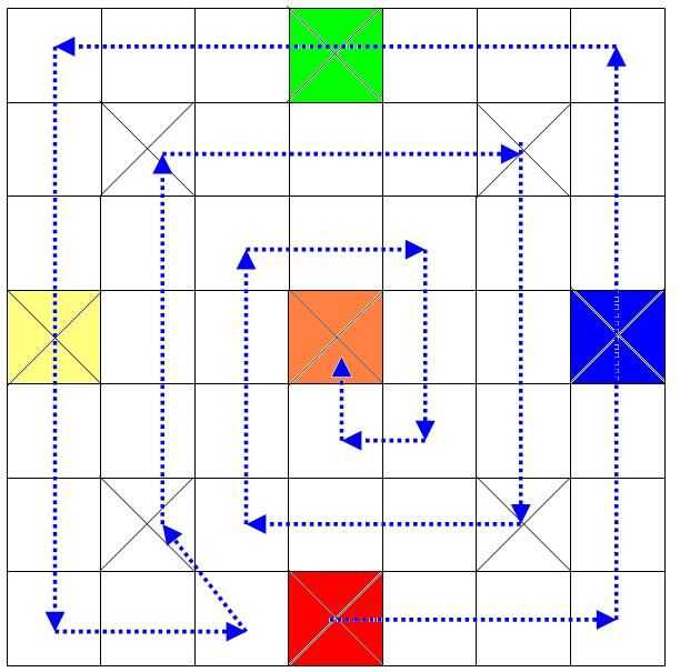 Cada jugador tiene 6 monedas hacia las monedas de la casa objetivo según la línea en el cuadro (dibuja para el jugador rojo como sabio para otros). Que alcanzar todas las seis monedas primero al centro es el ganador.