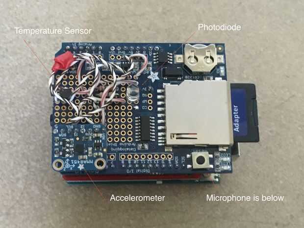 El siguiente paso es construir y el circuito de la soldadura. El circuito no es especialmente complicado o extenso; debe ser fácilmente posible montar todos los componentes en las áreas de creación de prototipos de los tableros. Recomendamos colocar el micrófono en el escudo de espectro para la facilidad de acceso, y es importante que los sensores de luz y temperatura terminan en el tablero superior (para que sean capaces de detectar eficazmente el medio ambiente). De lo contrario, sin embargo, opciones de diseño son hasta usted.