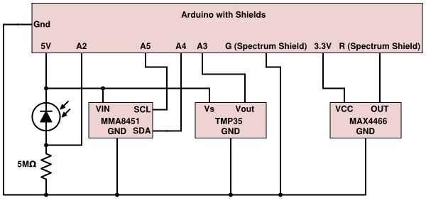 El sensor de temperatura genera un voltaje que aumenta linealmente con la temperatura en grados celsius (con un cambio para éste pueda ser efectivo por debajo de 0° C). Los otros elementos del circuito principal son asimismo simples en cómo funciona su sistema de circuitos; la mayor parte del trabajo se realiza en el bosquejo necesario para leer los datos. Para el micrófono, la salida directamente a la patilla de R en el escudo de espectro de soldadura elimina la necesidad de utilizar al conector de entrada en el lado (y el uso de adaptadores adicionales).