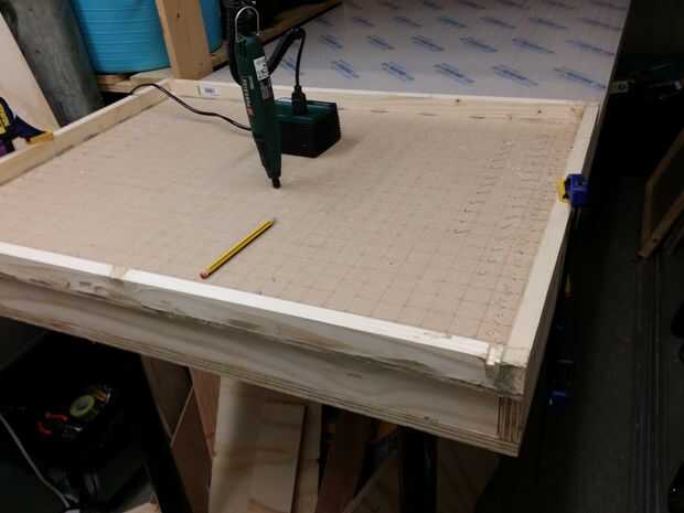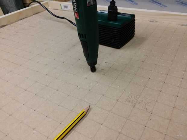 Paciencia y mucho cuidado se requieren para perforar los agujeros de 2800 x 1mm en la superficie de juego de plexiglás.