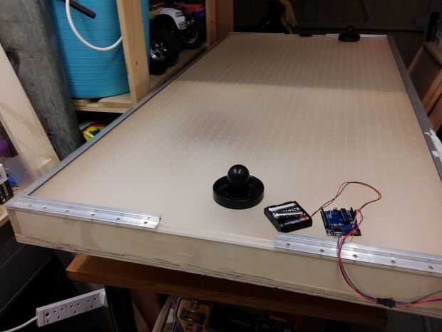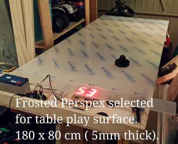 La superficie de juego de mesa plexiglás helada selecta debido a su resistencia al rayado, resistencia y porque quería Casa 7 segmento score display y LEDs programables bajo la superficie de juego. Nunca antes visto pero límite de meta y mitad forma aparecerá una línea cuando se activa la tabla, también con Arduino un poco código me permitirá cambiar objetivo límite color, brillo o secuencia LEDs en gol - persiguiendo, color limpie etc usando bibliotecas de Neopixel. También planea colocar 10 minutos LED juego temporizador de cuenta regresiva bajo la superficie de juego de helado en cada extremo.