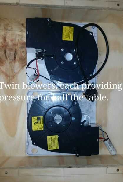 Ventiladores sopladores cerrado y separador/soporte de la mesa equipadas para separar la salida del soplador a cada mitad de la tabla, evitando corrientes de aire circular interferir PUC durante el juego.
