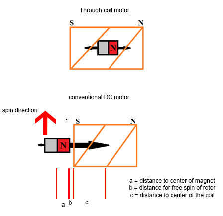 Mi hermano con poco pensamiento diferente acerca de este tema, explicación de la mina es: como ya saben el metal (o imán) permanecerá en el centro de la bobina energizada, que significa la fuerza mayor está ahí justo en el centro de la bobina. Motores convencionales nunca pasa por el centro, a pocos paso de la bruja de distancia es el espacio entre el rotor y el estator, permitiendo que el rotor gire y la mitad de la longitud de la bobina (también la mitad de longitud del imán, ver imagen adjunta). Eso es por qué se pretende hacer la longitud de la bobina más pequeña posible. Problema es que con la corta longitud de la bobina, tienes que enrollar el alambre del imán más, porque está aumentando la duración del bucle con todas las capas adicionales. Para la bobina: bucles más = más fuerza, más cable menos eficiencia.
