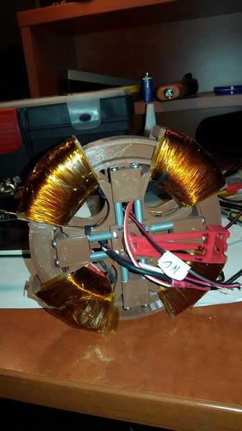 Primer paso es enrollar bobinas, usamos 0, cable de calibre de 3mm con fuente de alimentación de 48V a alrededor 1, 8A de sorteo. Así que la resistencia debe ser alrededor de 27ohms. Si utilizamos ley de ohms :) Que es bueno saber cuántos bucles debe hacer para lograr la liquidación de 27 ohmios. R=ρl/s resistividad del cobre es 0.0169x10-6 ohmios a un metro, S para 0, 3 mm alambre de es 7, 0686 x 10-8 m3 de eso calculamos que cable debe 111 m de largo redondeado hasta 120 metros. Circunferencia de nuestros impresos 3D es 9,6 cm tenemos que 1200loops al grupo de una bobina, al final que vamos a terminar con bobina de 4 x 600loop. Tapa de bobina de pegamento a la bobina antes de enrollar. Buen consejo es utilizar cinta de kapton. Cortar 60 pequeños trozos de cinta de kapton primero y pegar cada 10 giros que ha realizado, que le ayudará a contar cuánto hizo falta piezas de cinta de kapton. También cubren todo capas de kapton cinta para enrollar fácilmente a continuación. EH.