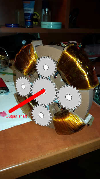Aquí se trata de usar engranaje planetario con planetas en las ruedas para hacer una salida común. Planetas pueden hacerse ruedas de apoyo funcionando en la superficie del engranaje de los dientes del rotor, por lo que el engranaje de salida puede estar oculto dentro del motor. Esto puede ser aseado pedazo de hardware con engranaje integrado.