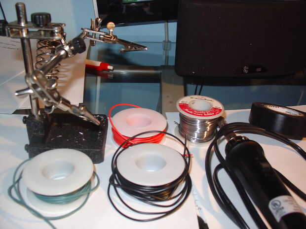 También: Cinta aislante, soldar pistola o hierro, soldadura, y me gusta usar una tercera mano que sujetan objetos para hacer soldadura que mucho más fácil.