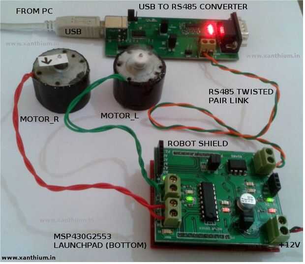 Dos motores están conectados a los terminales del chip L293D. El MSP430 espera órdenes de enviar de la PC mediante el cable RS485, de recibir los comandos, que el controlador cambia los motores de encendido y apagado.
