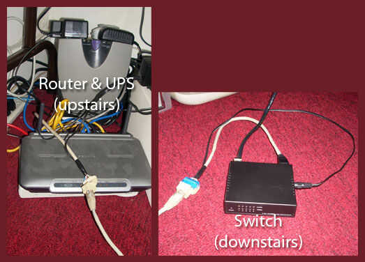 Mi router y UPS se encuentran en la planta superior. Conectar el adaptador de CA en el lado de la batería de la UPS. Entonces conecto el enchufe ethernet en el router. Luego enchufo en cable de ethernet de 30 pies que funciona en la planta baja a un conmutador de red. El interruptor utiliza el otro adaptador para proporcionar energía y conexión de red.