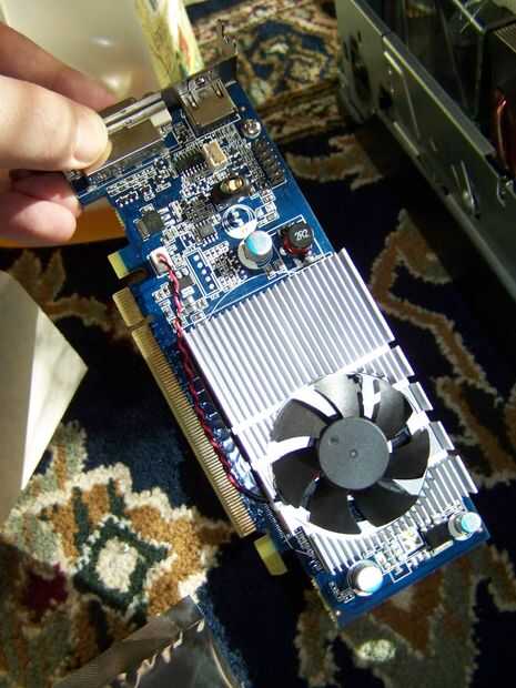 Ahora sólo tiene que añadir la tarjeta de video.  Esta tarjeta es de bajo perfil, para que quede el caso.  Vas a tener que quitar el parte movible del metal en la parte posterior de la caja por primera que gira encima de la pieza de metal que mantiene todo.  Entonces sólo Deslice la tarjeta en la ranura PCI-E.
