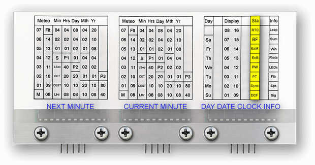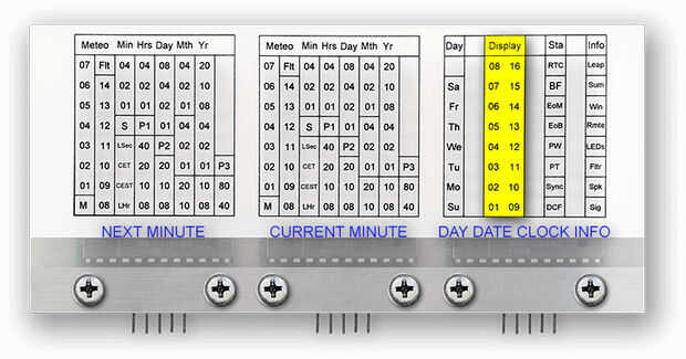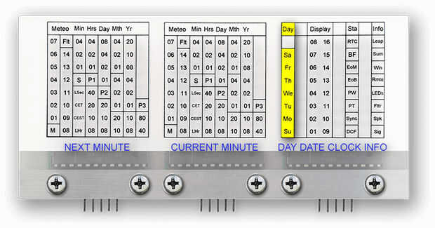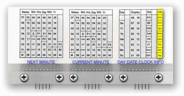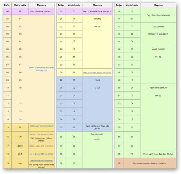 Este cuadro muestra un resumen de todos los datos sobre un minuto completo y la traducción al código transmitido DCF77 para cada valor de búfer