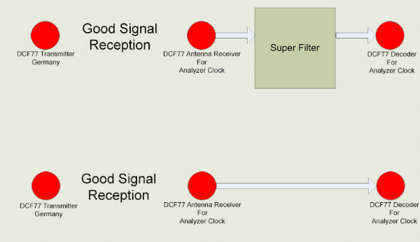 La fila superior muestra el filtro Super encendido. Una vez sincronizado y sintonizada en la señal el filtro Super sintetizar una señal buena incluso cuando se pierde completamente la señal. En una señal de ruido el filtro Super buscará para los bits de la señal conocidos y mantenerse sincronizado con el transmisor. La fila inferior muestra el filtro Super apagado. Se recibe cualquier señal (bueno o malo) se envía al decodificador. Nota el filtro Super entrada está siempre conectado a la señal DCF77 incluso si está apagado el filtro Super. Como el Super filtro puede tomar unos días para afinar con precisión máxima asegura que siempre está sintonizado/sincronizados al máxima precisión a la señal DCF77.