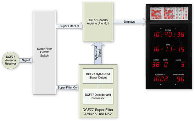 Cuando se enciende Super filtro la Udo Klein procesa activamente la señal DCF77 de la antena/receptor. Sobre un número de días de aprender el Super filtro puede predecir la señal DCF77 y utilice esto para determinar si la señal de entrada contiene errores. El filtro Super luego sintetizarán una señal DCF77 corregida incluso si la señal está ausente.