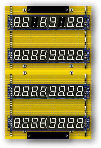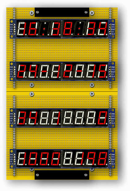 Cuadro 02 muestra 7 módulos de exhibición de segmento montados junto con bloques de madera negras para fijar cubierta de plexiglás densidad neutra contraste pantalla. Nota adhesiva de colon de cinta negra en el módulo de la pantalla superior.