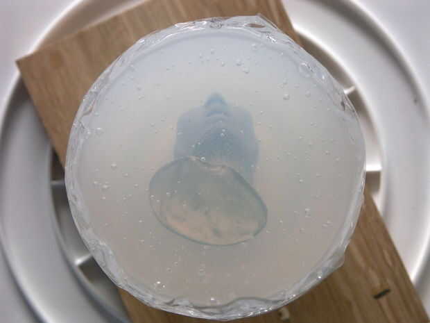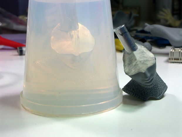 Esto fue un intento de hacer un molde de bloque monolítico para la cabeza. Esto no funcionó muy bien porque no sólo fue desmoldear la pieza como una trampa de oso (la silicona era demasiado dura para este estilo de molde), hizo una línea de partición áspero a lo largo de la parte posterior de la cabeza que sería muy difícil de limpiar. El molde final se divide frente a la parte posterior con una línea divisoria a lo largo de la costura en el lado...