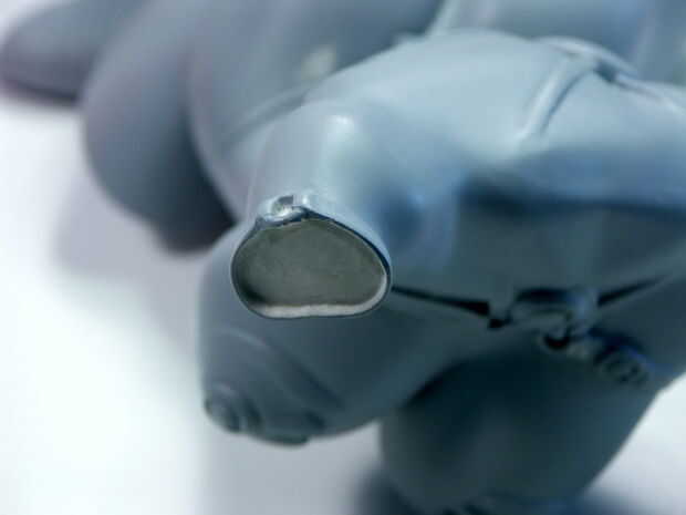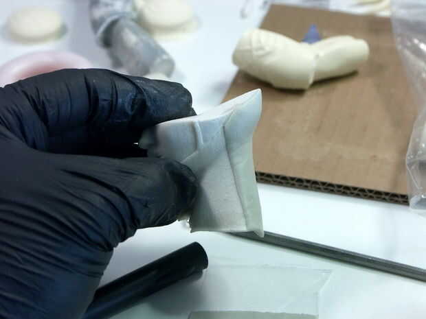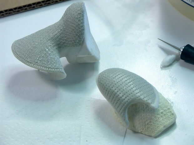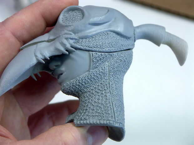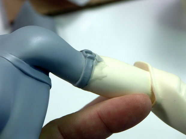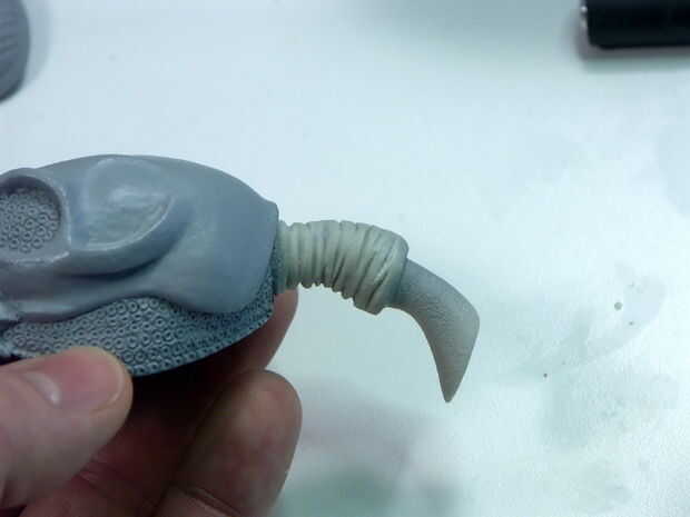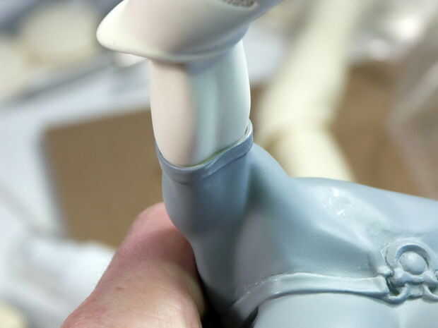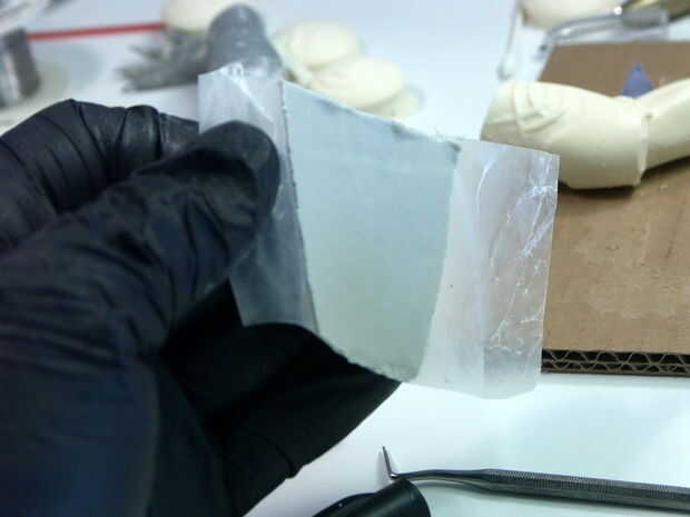 Ahora, surge un problema: ¿Cómo hacer una capa muy delgada (1/32") de epoxi modelar (arcilla) que es * consistente * en espesor a través de él es superficie? Tratando de hacerlo manualmente (slathering alrededor hasta que quede un grosor uniforme) es mucho más allá de mi nivel de habilidad o paciencia - por lo que se me ocurrió un truco muy simple: estirar la arcilla como una base de tarta y luego pegarlo en el modelo. El problema entonces se convierte en "¿Cómo puedo evitar que la arcilla se pegue a mi rodillo? (pedazo de tubo de PVC, en mi caso) Descubrí que si pongo la arcilla entre dos pedazos de papel de cera, podría rodar hacia fuera, retire a un lado y use el otro lado como un aplicador - funcionó realmente bien. Un pequeño truco a tener en cuenta: una vez aplicado, no inmediatamente empezar a esculpir y añadiendo detalles - la arcilla es demasiado suave y se convertirá en ruido de fondo muy rápidamente. Lo quiero hacer es esperar unos 25-45 minutos hasta que la arcilla está empezando a conseguir la firma y a continuación, iniciar agregando los detalles. Capa de arcilla con una capa delgada de vaselina para que herramientas utilizar se deslice fácilmente y no se adhieren a la arcilla - y seguir adelante y agregar detalles como sea necesario.