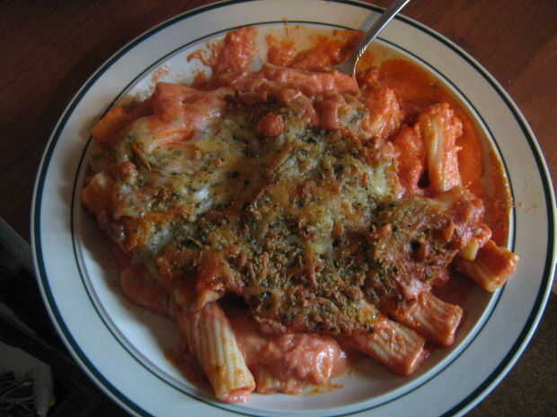 Pasta Al Forno (horno Ziti) con calabaza y receta de pollo (diario libre):16 oz cocinado Rigatoni (Al Dente)3 tazas de pechuga de pollo cocida (yo usé sobras)2 tazas de puré de calabaza1 lata de leche de coco1 cucharadita de salPimienta negra y sal (