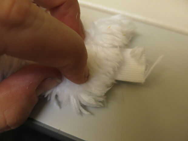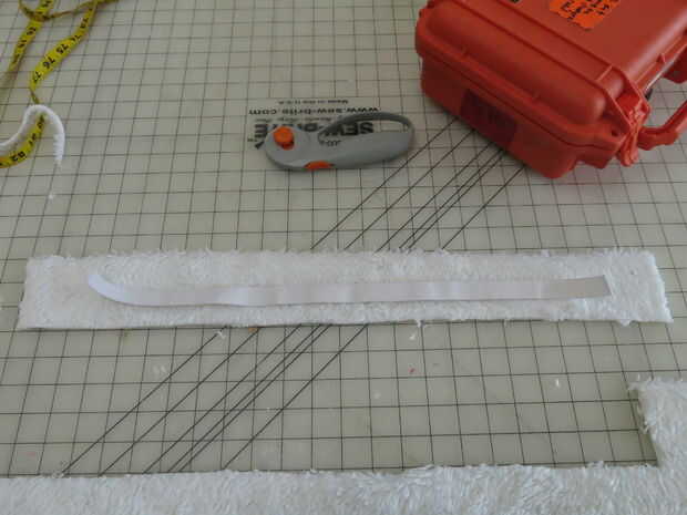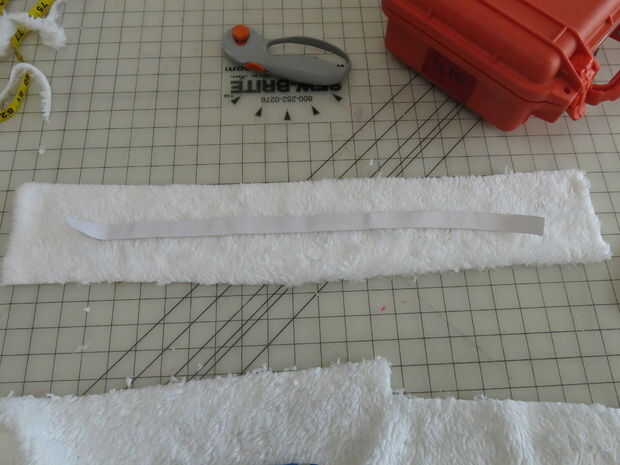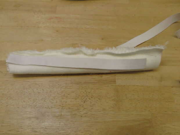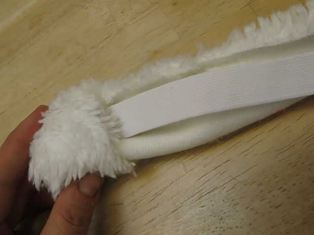 Medir aproximadamente 4.5"(puede variar dependiendo de tu pie) de correa elástica. Medir la tela que elegiste que coincide con las zapatillas de conejo (yo usé 1/4 yarda de blanca piel falsa). Debe ser aproximadamente 7" largo y 4 veces tan amplia como su correa elástica.