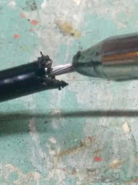 Ahora, el cable puede haber pelado un poco cuando corte el cable originalmente (quinta foto), pero no hay que preocuparse. Girando el cable contra la dirección en que apunten hacia los filamentos del cable, el cable se pasan por el cuerpo y salir al otro lado.