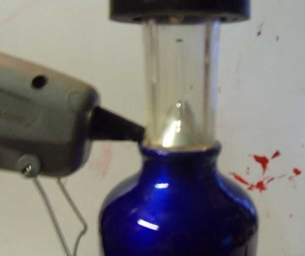 I poner unos toques de pegamento en la parte inferior de la lámpara "globo" y colocado en la boca del envase y luego corrió un suave cordón de pegamento alrededor de la base del "globo" totalmente adjuntarlo y esperemos que la sello de tiempo.