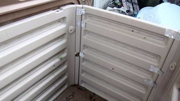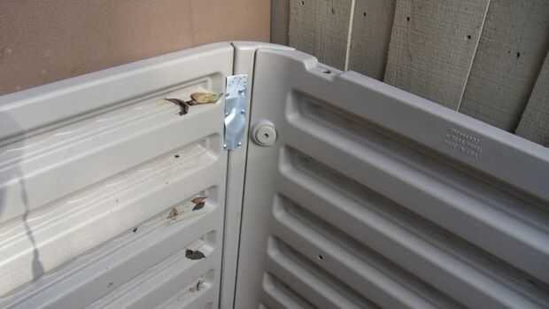 después de cortar algunos viajes de las hojas de aluminio, usé self tapping tornillos para fijar las tiras y unir los lados. En la foto 1 es mi 1 º intento con una tira larga bajando por la costura, era difícil conseguirlo en su lugar y se atornilla abajo, se muestra en el siguiente foto lo hice las otras 3 esquinas. Aunque este servicio parece que funciona bastante bien, voy a añadir algunas hojas llenas a las esquinas exteriores. Desde los ganchos que actúan como bisagras de la tapa que falta puedo conectar algunas bisagras reciclado pero voy a tener que pensar en una alternativa más