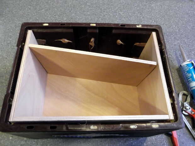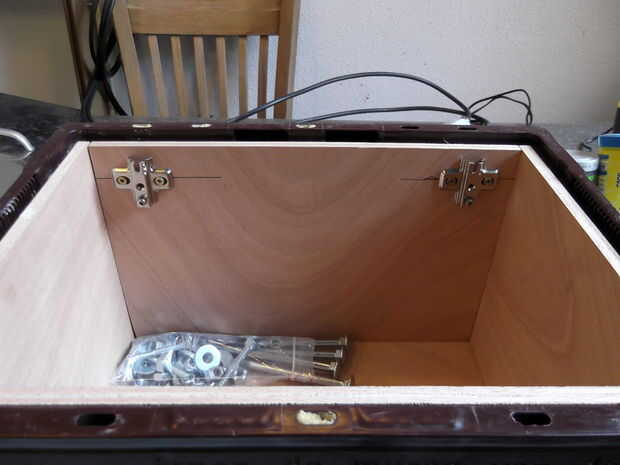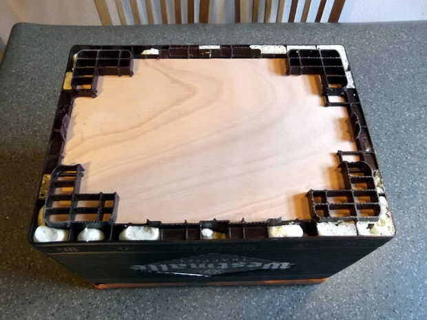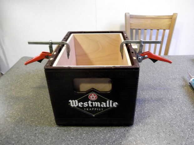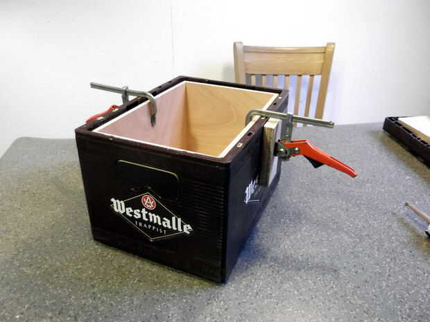 Decidí pegar planchas de madera en el beerbox. Esto da un fondo perfecto y una superficie perfecta para sujetar la manija y las bisagras. Utilizar pegamento de poliuretano.