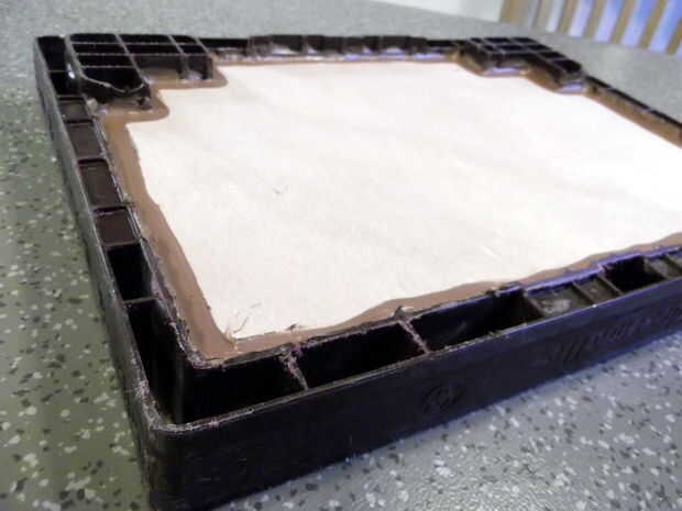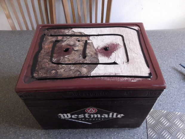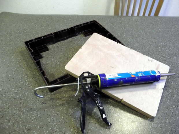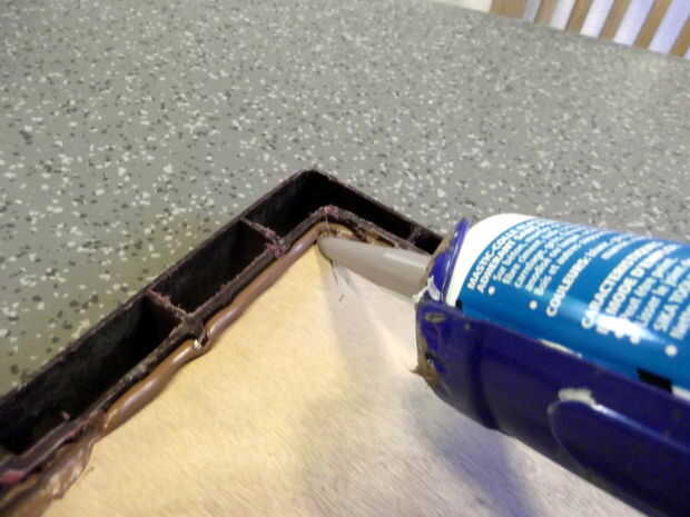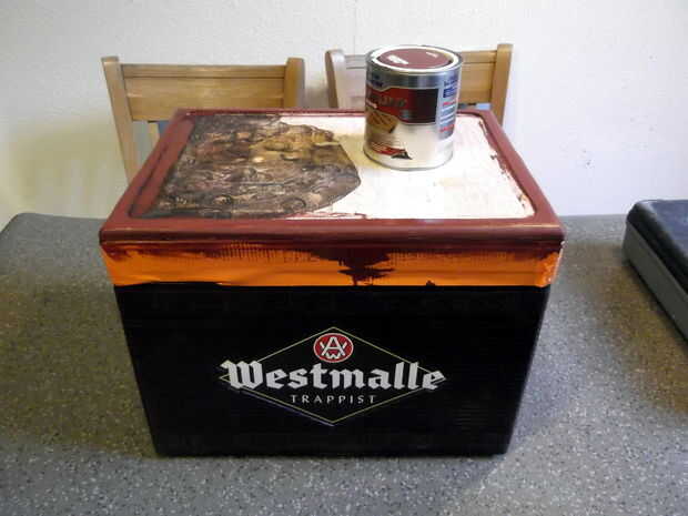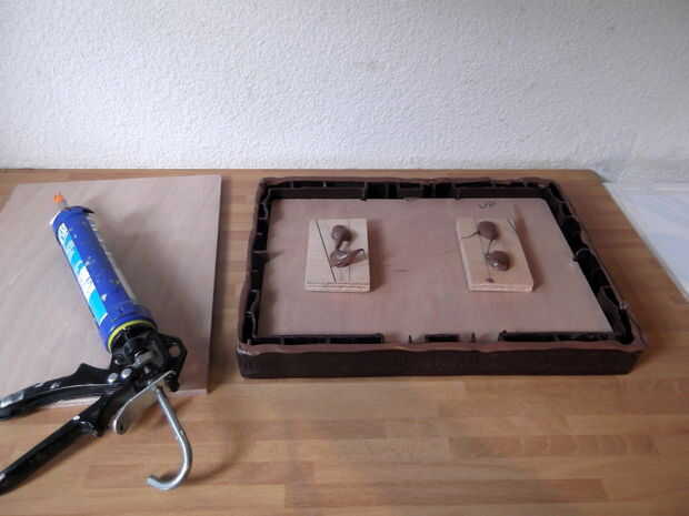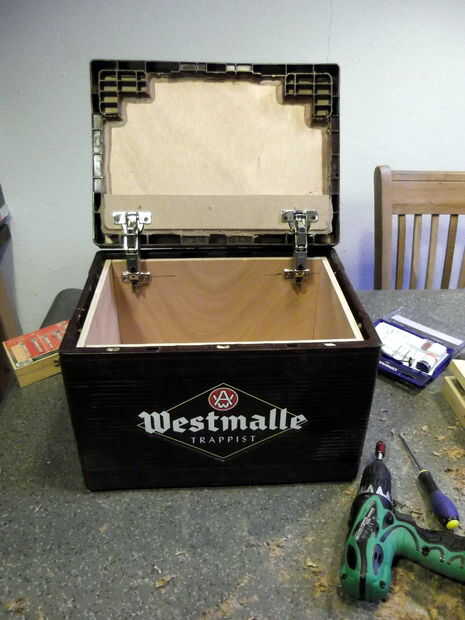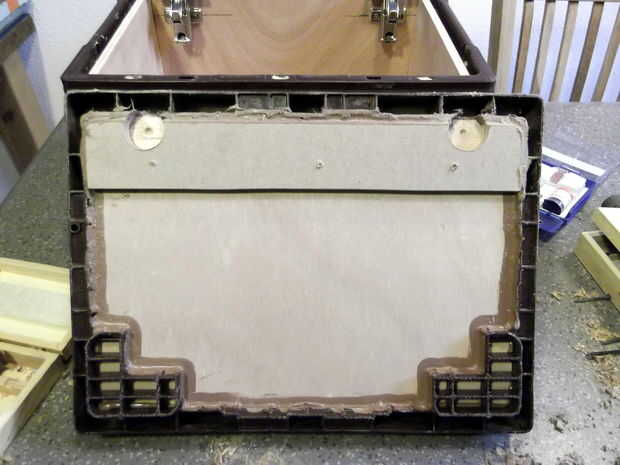 Cortar la parte inferior de la segunda caja, planchas de madera de la forma e ir para el pegamento. Use madera contrachapada gruesa adentro, pequeña madera exterior, con un pequeño trozo de madera contrachapada en el envés de la tapa como soporte para las bisagras. Taladrar los agujeros para las bisagras.