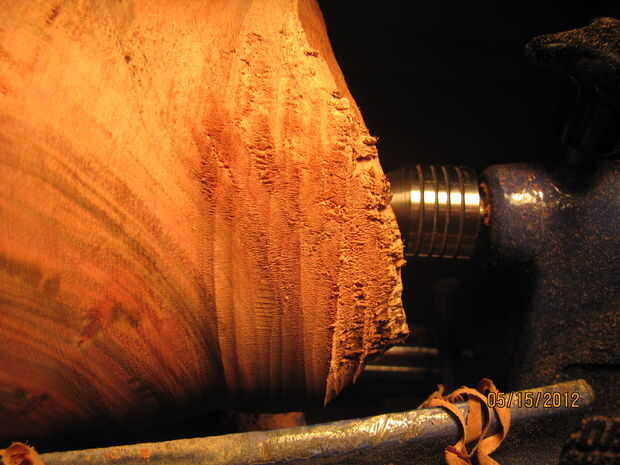 Asegúrese de que la herramienta está afilada, tornillo de la placa en el torno y empezar a girar. Dependiendo de las características de su torno y su registro, puede un ser cierta área donde tiene que empezar a cortar en primer lugar, pero solo mire y use el sentido común. En general, empiece a cortar cerca de la zona más desequilibrada primero así que usted puede balancear rápidamente. La mejor manera de hacer un buen trabajo es practicar. Tener mucho cuidado con las esquinas. Probablemente no podrás verlas muy bien-se ven como una sombra. Asegúrese de que usted es consciente de Dónde está la madera. Una vez que el registro comienza a suavizar, desarrollar un poco la forma con la gubia desbastar. Asegúrese de que el resto de la herramienta es siempre lo más cerca posible de la madera de spinning. No llegar demasiado al final forma porque arranque todavía será excesiva.